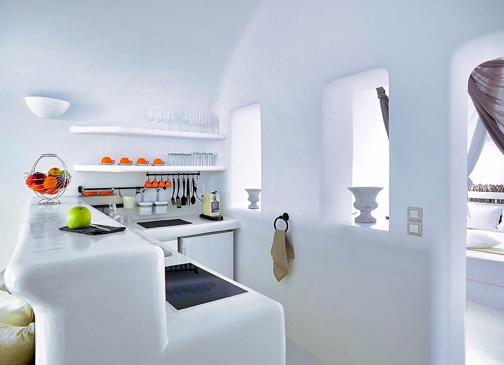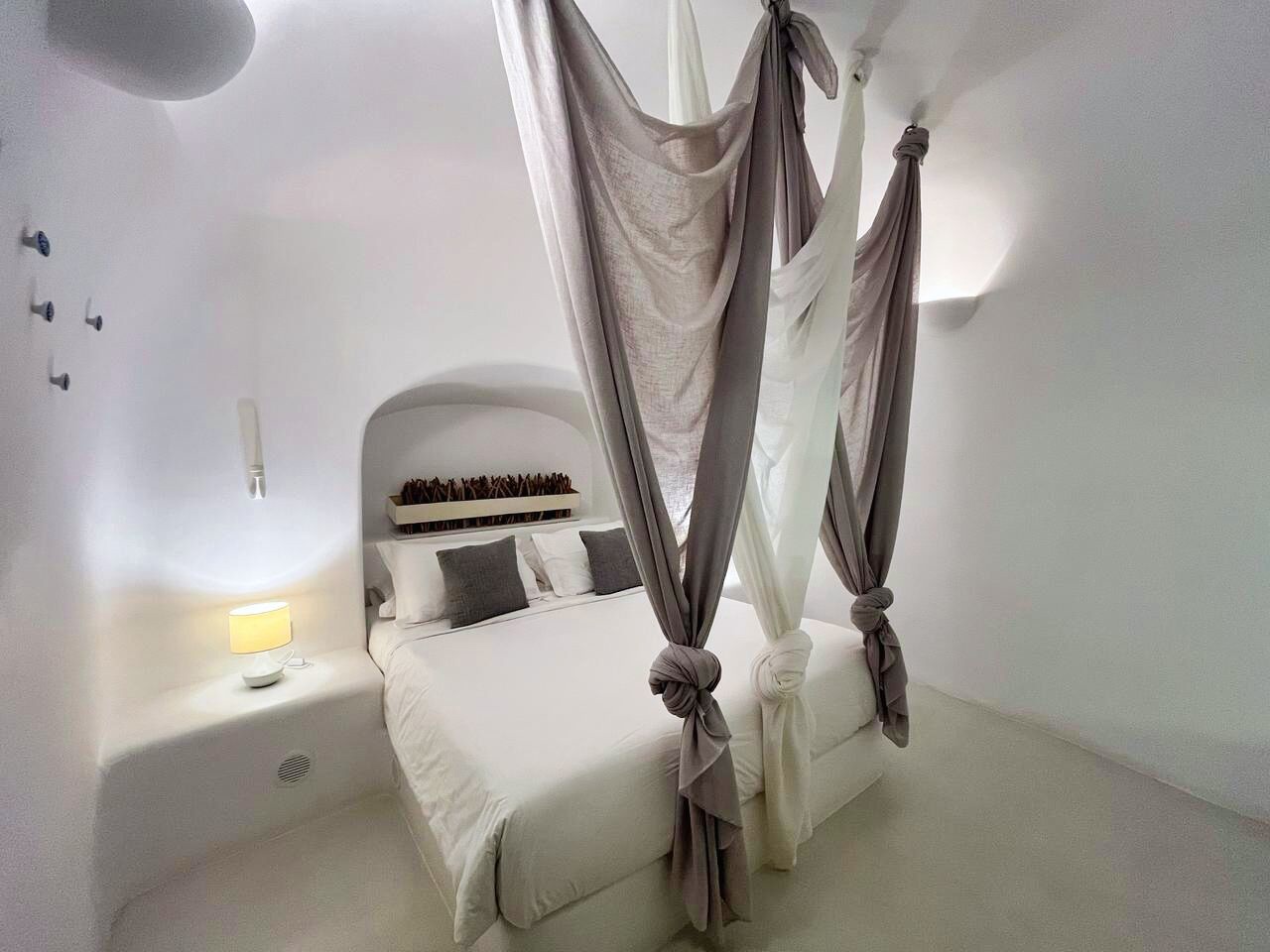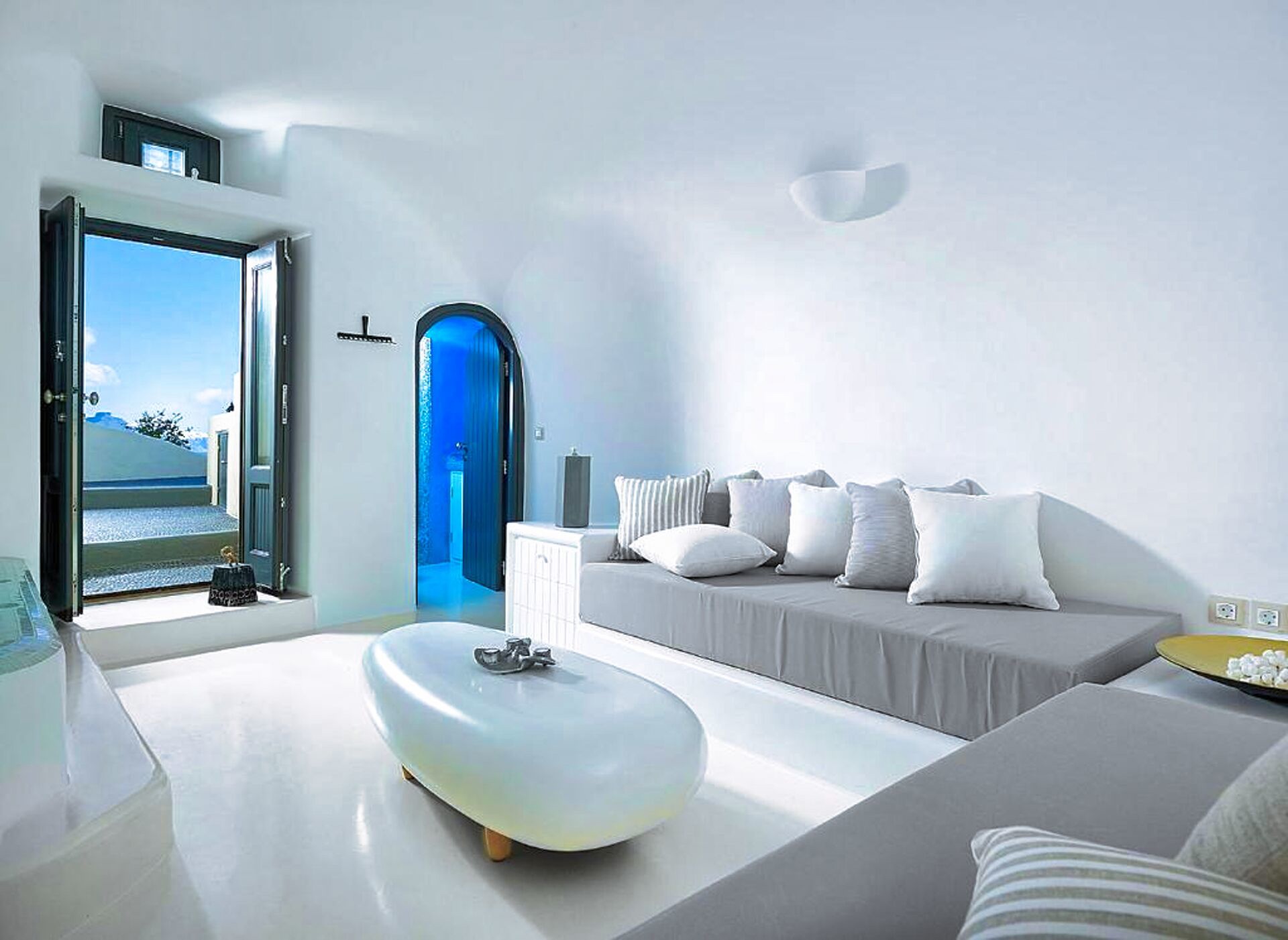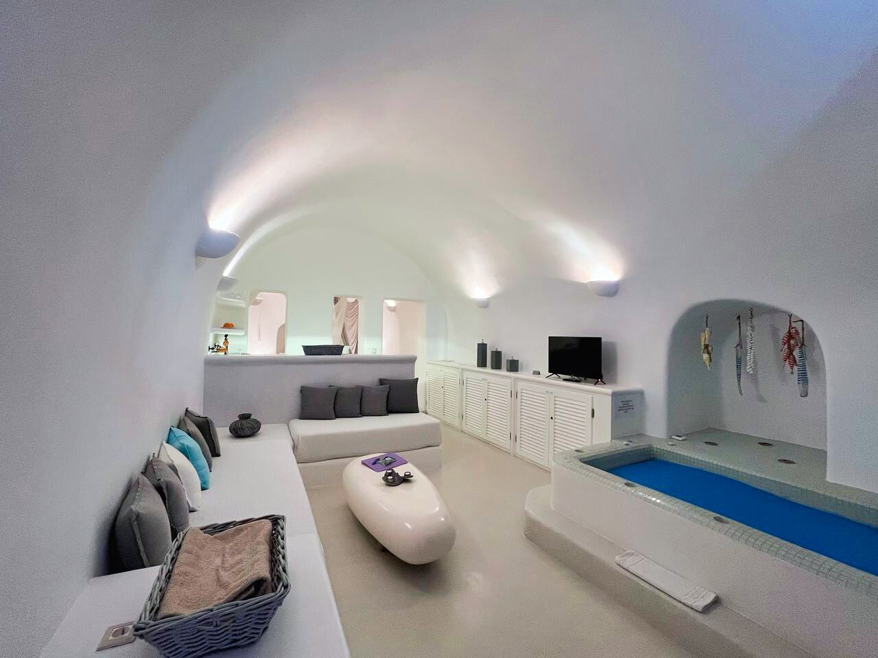 Wenn man die Schwelle dieser Residenz im Höhlenstil überschreitet, wird man sofort von einem Gefühl der Kühle und kykladischer Eleganz umgeben. Die in Weiß getauchten Innenräume bilden einen beruhigenden Kontrast zum intensiven Sonnenlicht der Insel. Im Wohnzimmer schaffen eingebaute Sofas in Kombination mit geschmackvollen Kissen in Grau- und Blautönen einen Raum, der Entspannung und Gastfreundschaft ausstrahlt. Weiter im Inneren sorgt das Schlafzimmer mit seinem eingebauten Bett und den klaren Linien, durch die kykladische Architektur für Ruhe und Erholung. Die minimalistische und dennoch äußerst funktionale Küche verbirgt hinter ihren makellosen weißen Oberflächen alle modernen Annehmlichkeiten, die für den Alltag oder besondere Anlässe benötigt werden. Das Badezimmer mit seiner eleganten Dusche und den sorgfältig ausgewählten Details rundet das Gefühl von privatem Luxus ab.