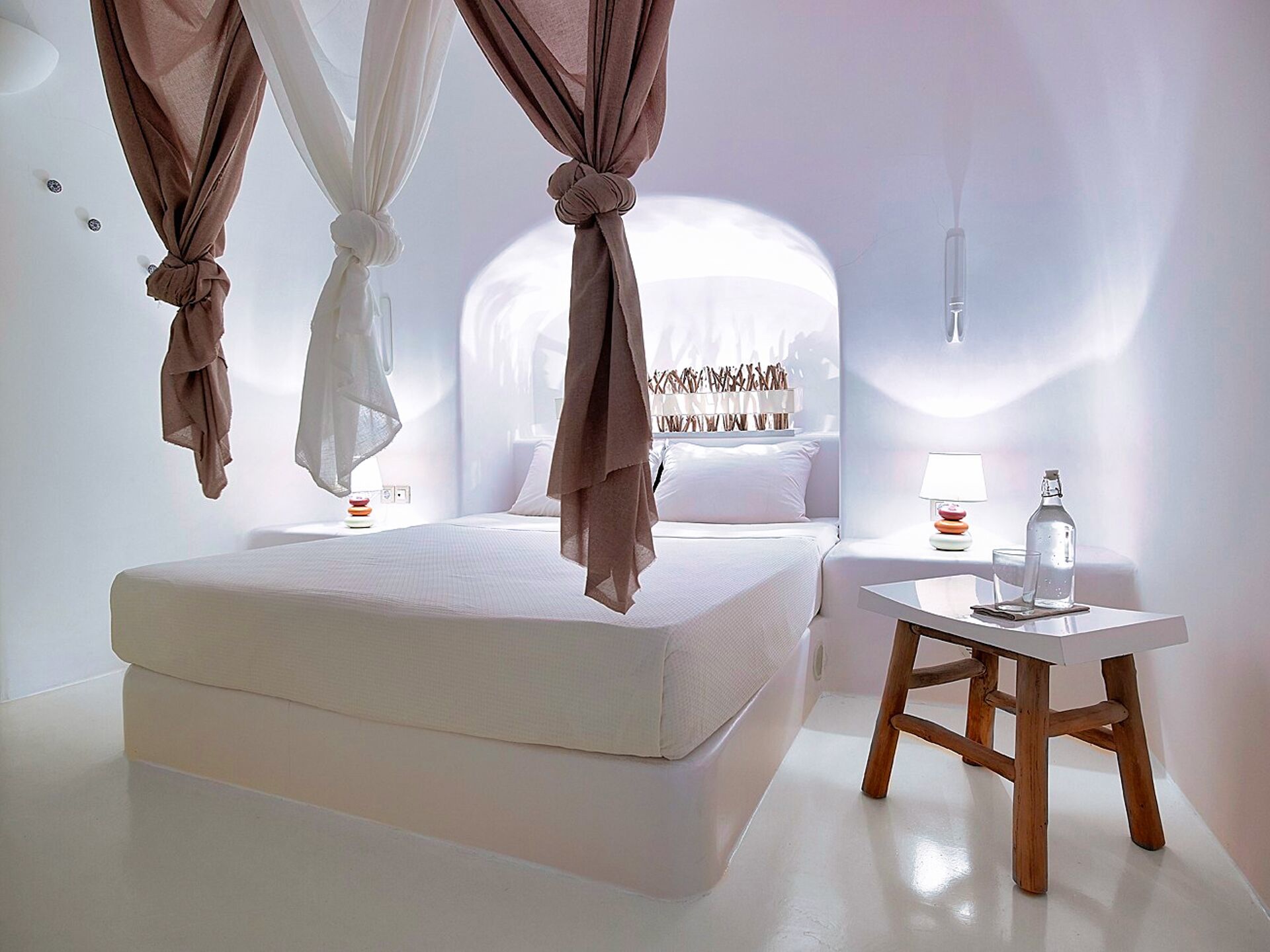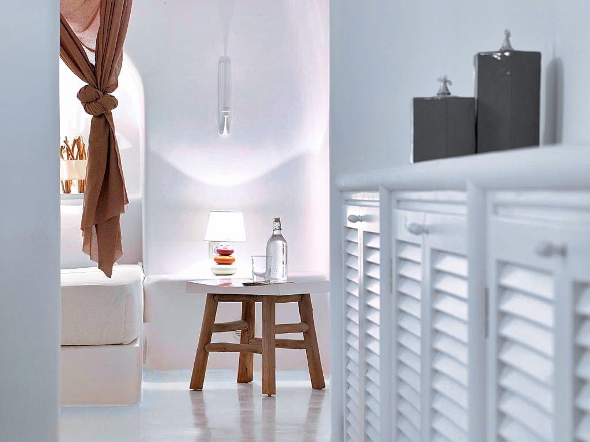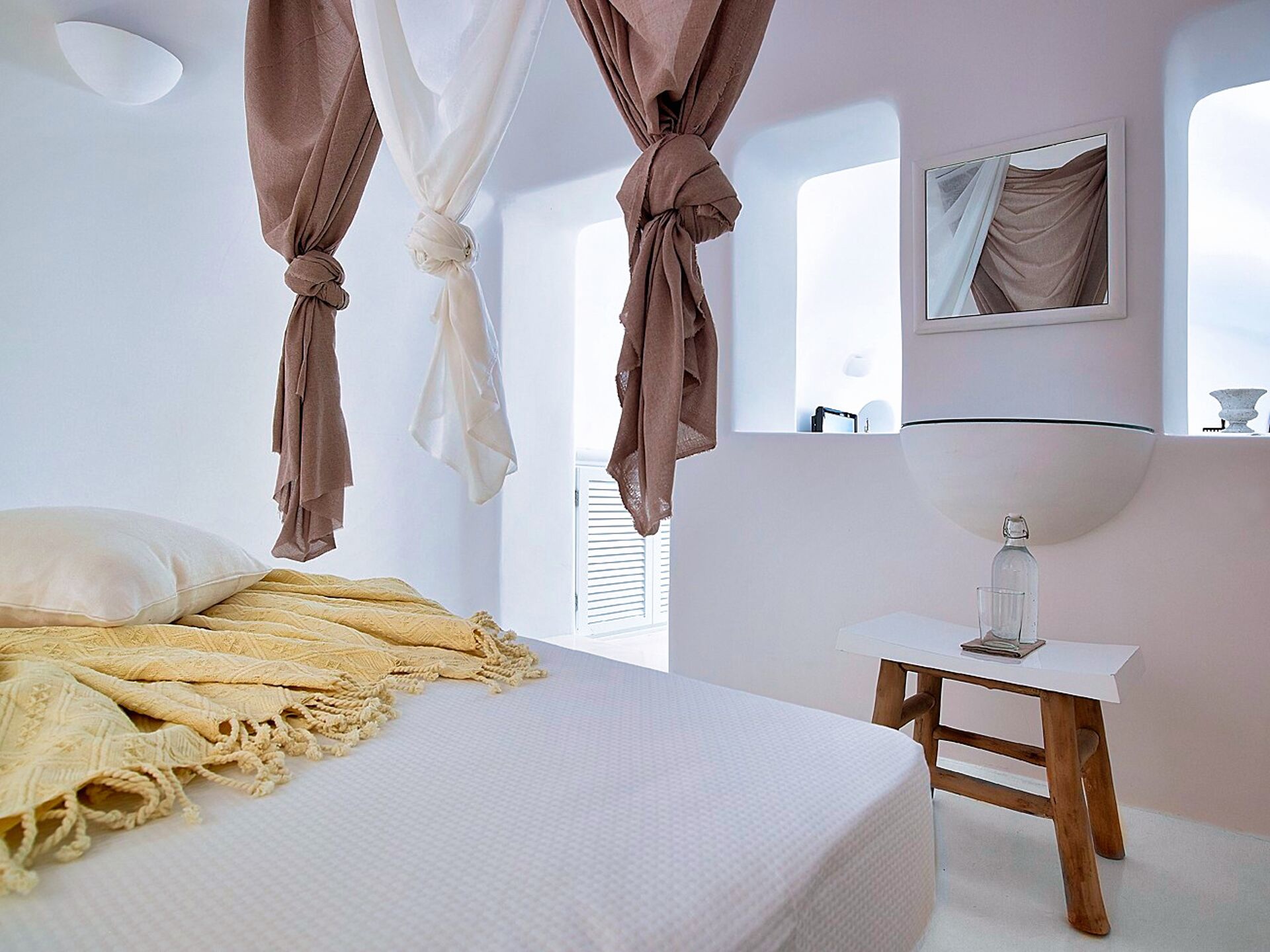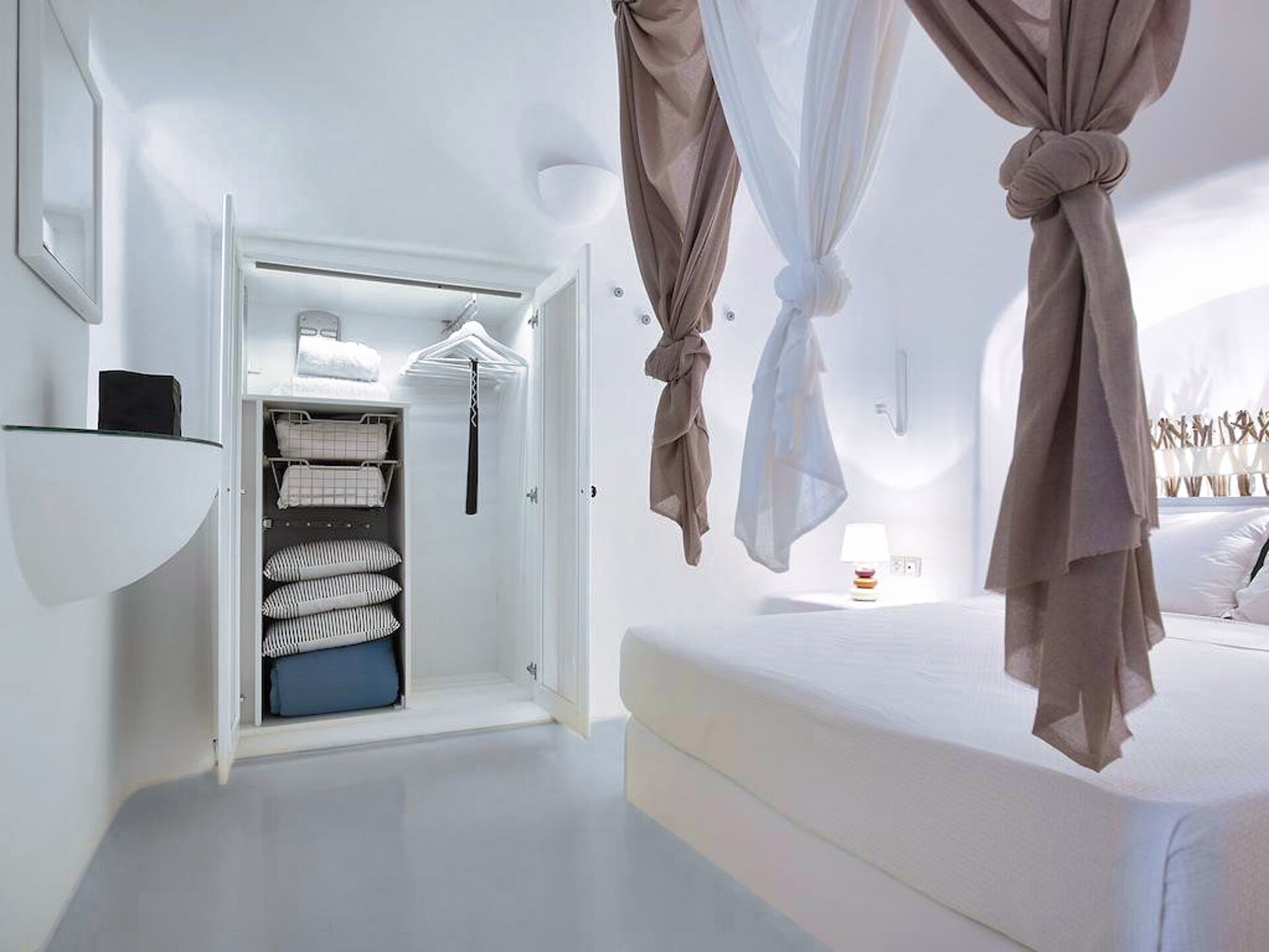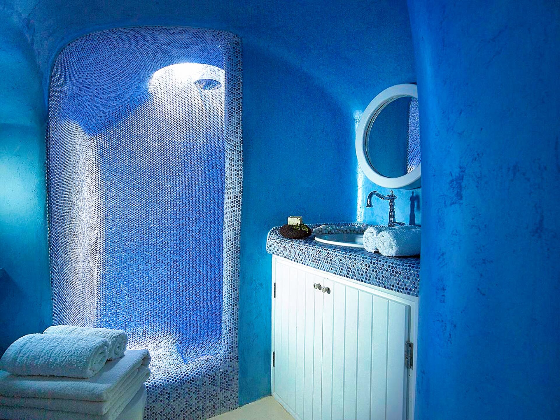 Wenn man die Schwelle dieser Residenz im Höhlenstil überschreitet, wird man sofort von einem Gefühl der Kühle und kykladischer Eleganz umgeben. Die in Weiß getauchten Innenräume bilden einen beruhigenden Kontrast zum intensiven Sonnenlicht der Insel. Im Wohnzimmer schaffen eingebaute Sofas in Kombination mit geschmackvollen Kissen in Grau- und Blautönen einen Raum, der Entspannung und Gastfreundschaft ausstrahlt. Weiter im Inneren sorgt das Schlafzimmer mit seinem eingebauten Bett und den klaren Linien, durch die kykladische Architektur für Ruhe und Erholung. Die minimalistische und dennoch äußerst funktionale Küche verbirgt hinter ihren makellosen weißen Oberflächen alle modernen Annehmlichkeiten, die für den Alltag oder besondere Anlässe benötigt werden. Das Badezimmer mit seiner eleganten Dusche und den sorgfältig ausgewählten Details rundet das Gefühl von privatem Luxus ab.