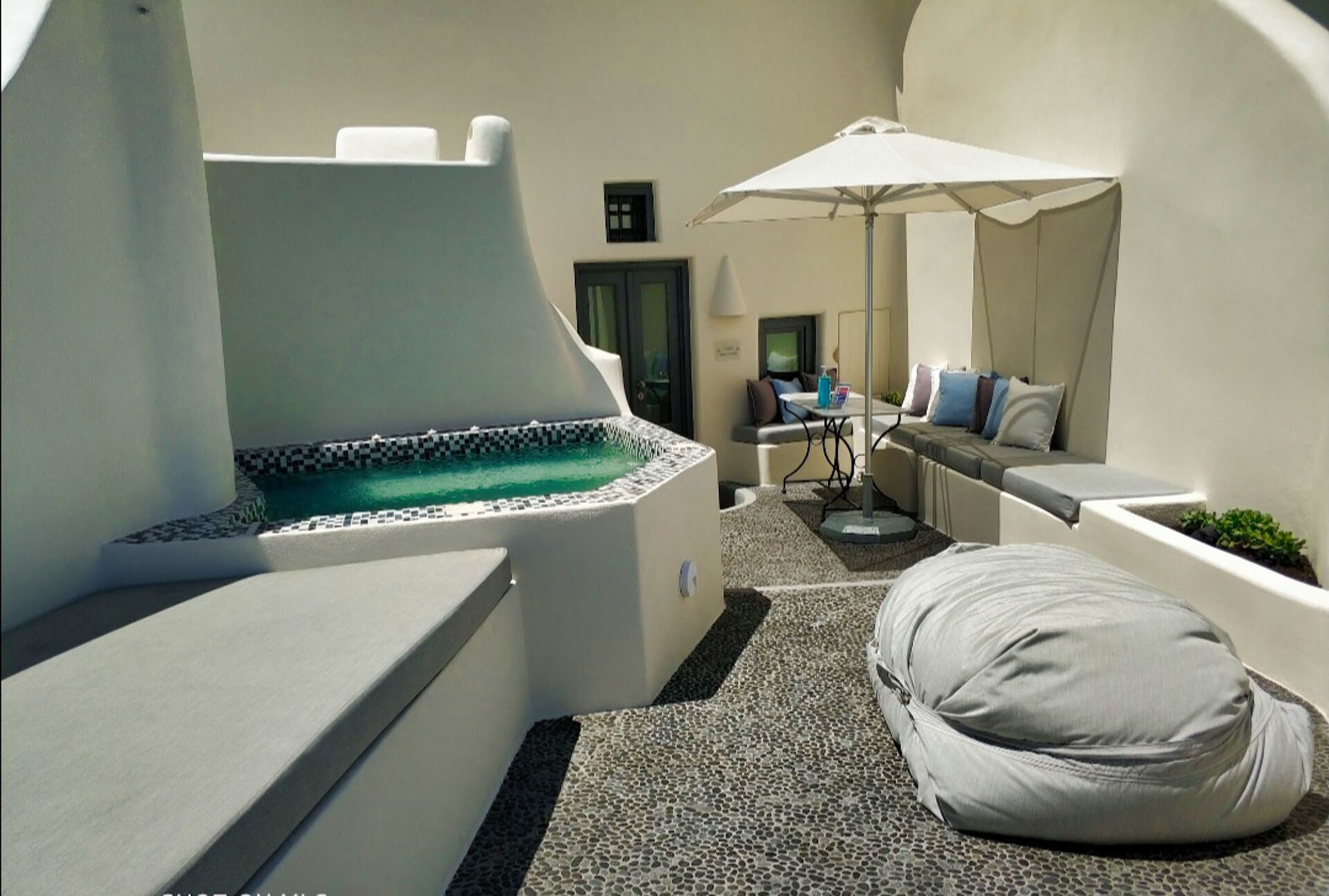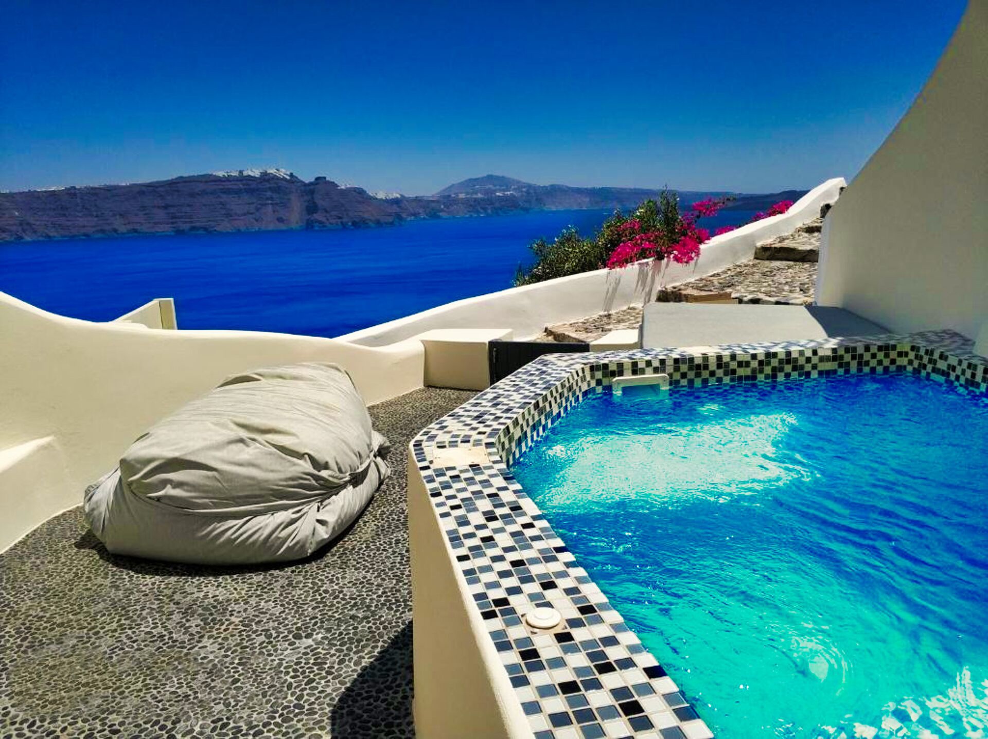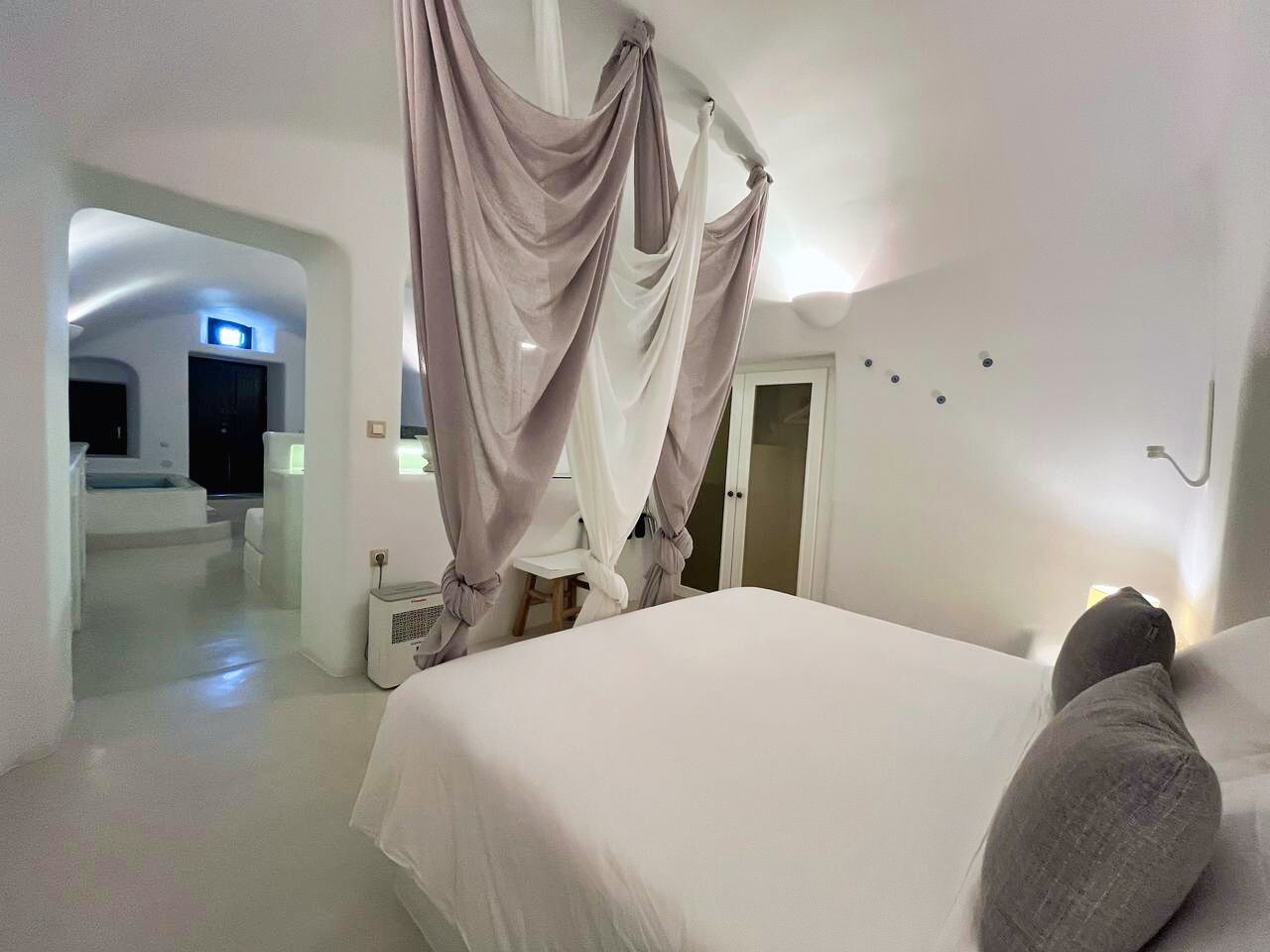 Die wahre Magie offenbart sich jedoch erst, wenn man die Terrasse betritt. Dort empfängt ein großzügiger Außenwohnbereich sowohl die ersten als auch die letzten Sonnenstrahlen. Der Blick schweift über die dramatischen Klippen der Caldera, die vulkanischen Inselchen und die imposante Silhouette des Vulkans von Santorini, der stolz in der Ferne steht. Die großzügige 37 Quadratmeter große Privatterrasse erweitert den Innenbereich nahtlos und verfügt über einen Außenwhirlpool, der sich perfekt für nächtliche Bäder unter dem Sternenhimmel eignet. Im Innenbereich bietet der beheizte Whirlpool auch an kühleren Tagen einen Ort der Entspannung.