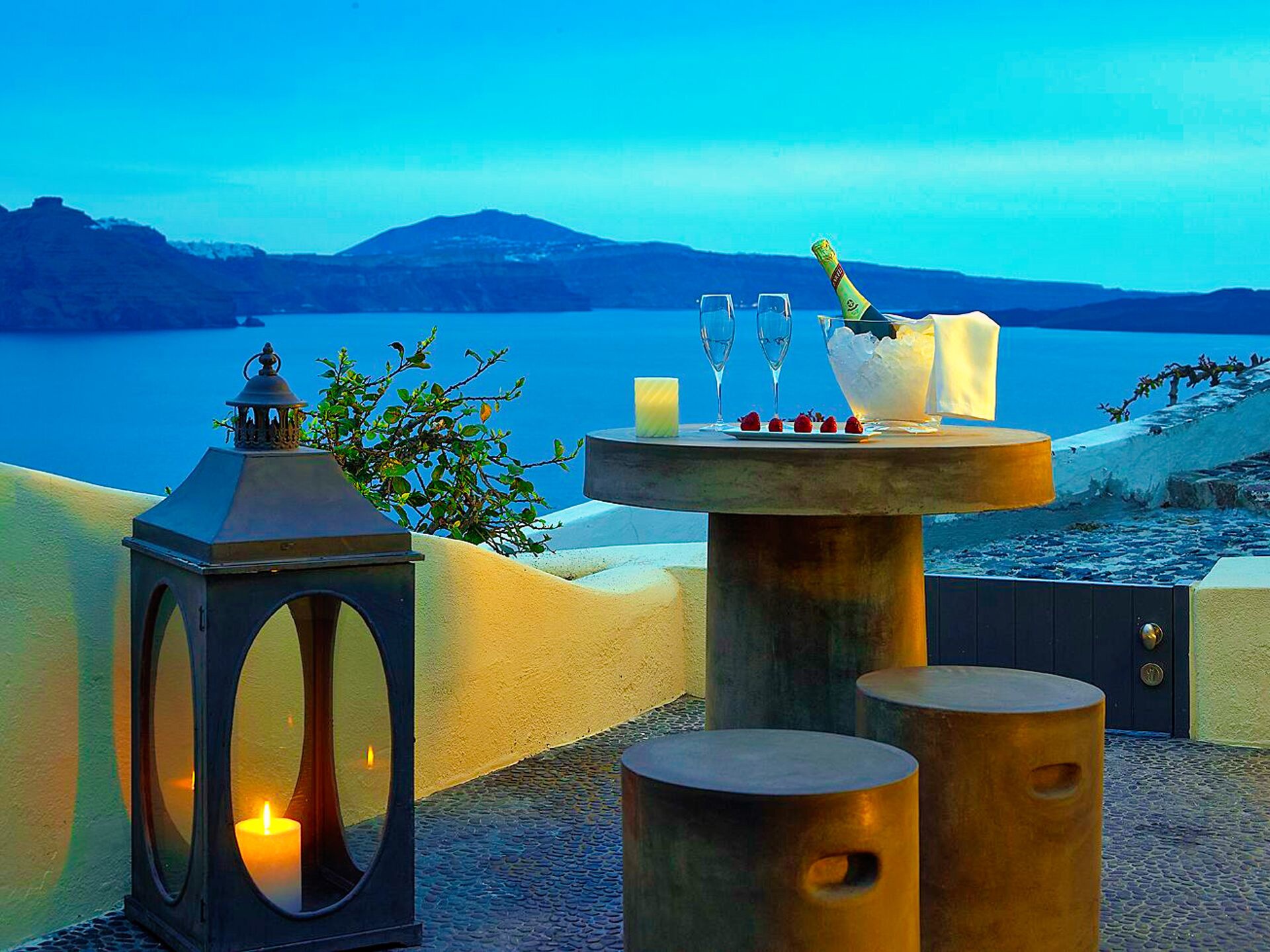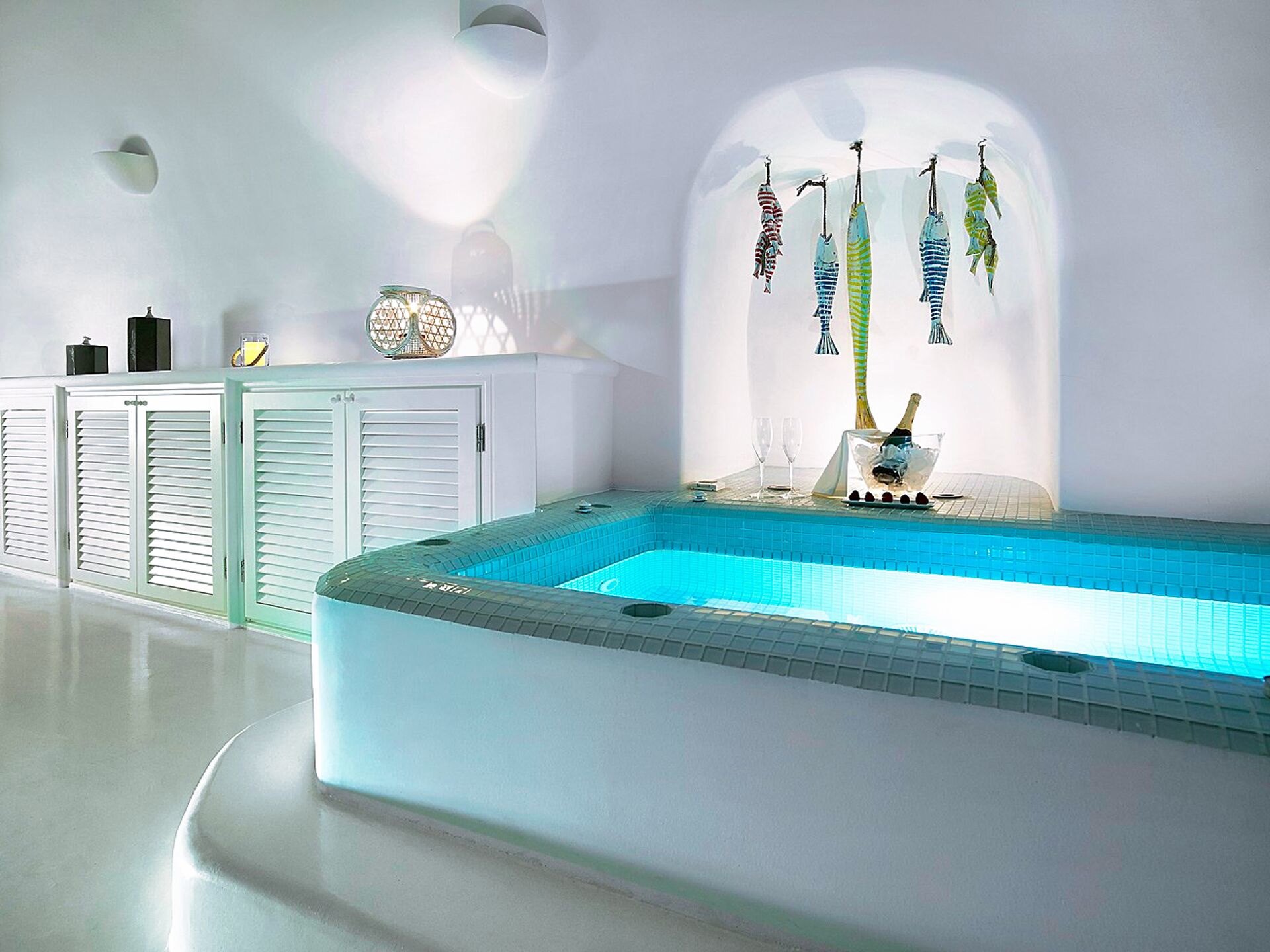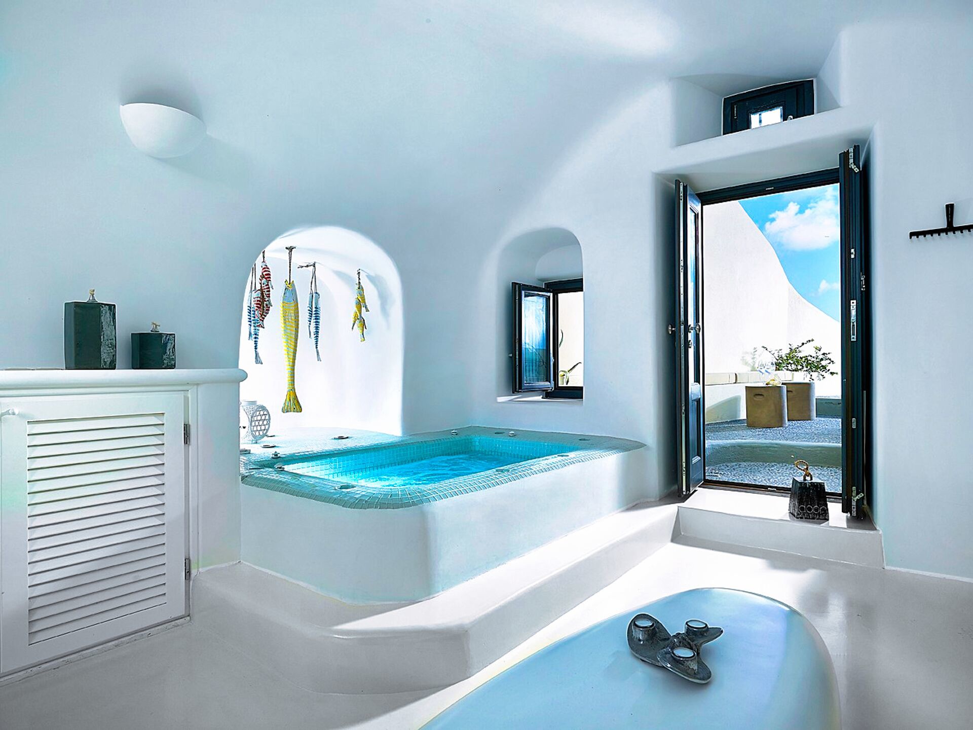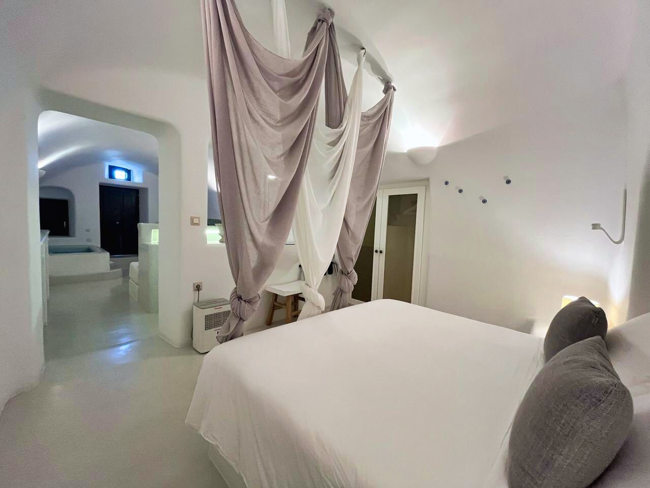 Die wahre Magie offenbart sich jedoch erst, wenn man die Terrasse betritt. Dort empfängt ein großzügiger Außenwohnbereich sowohl die ersten als auch die letzten Sonnenstrahlen. Der Blick schweift über die dramatischen Klippen der Caldera, die vulkanischen Inselchen und die imposante Silhouette des Vulkans von Santorini, der stolz in der Ferne steht. Die großzügige 37 Quadratmeter große Privatterrasse erweitert den Innenbereich nahtlos und verfügt über einen Außenwhirlpool, der sich perfekt für nächtliche Bäder unter dem Sternenhimmel eignet. Im Innenbereich bietet der beheizte Whirlpool auch an kühleren Tagen einen Ort der Entspannung.